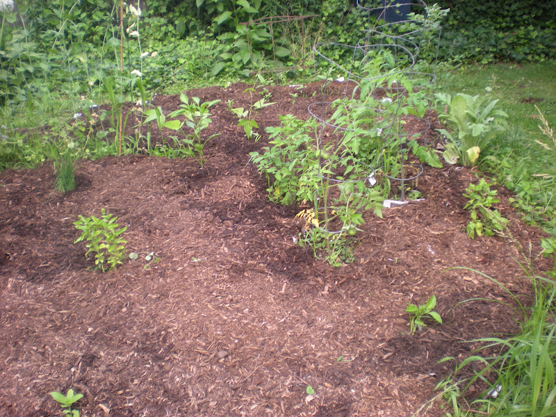 On Monday afternoon, in advance of the hell-hot heatwave we are currently sweating through, I got the mulch on the ground. As usual, I cleared out the weeds, spread newspapers between the plants, and then laid out a thick layer of wood mulch to control the weeds and help the plants survive the hot weather.